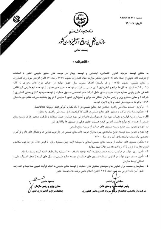 امضای تفاهم نامه همکاری صندوق حمایت از توسعه سرمایه گذاری در بخش کشاورزی و سازمان جنگلها