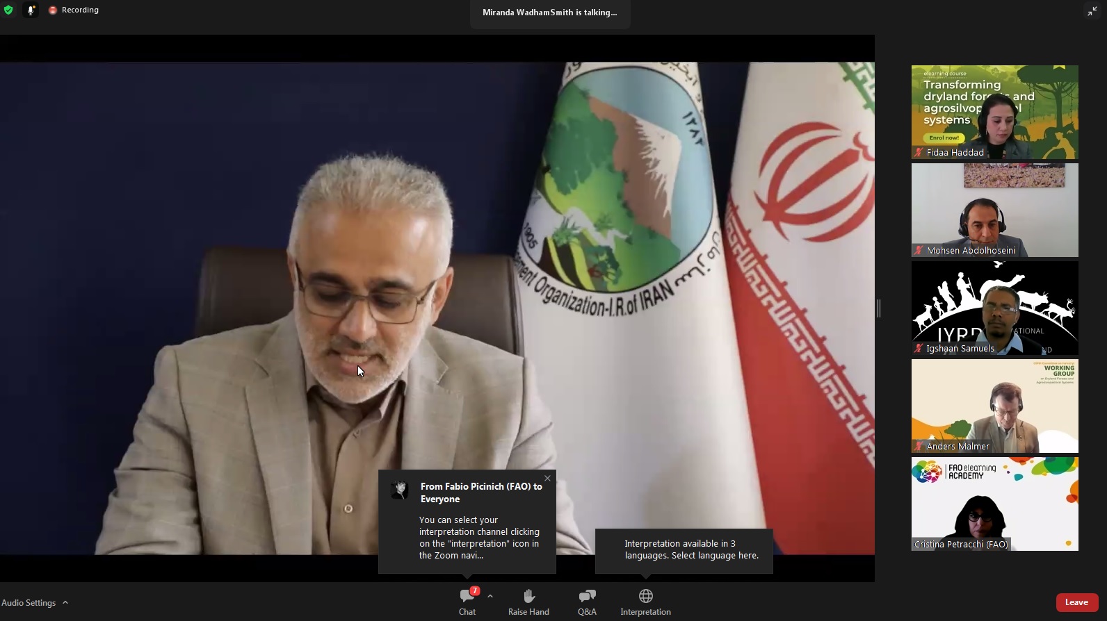 به گزارش پایگاه اطلاعرسانی سازمان منابعطبیعی و آبخیزداری کشور، دوره آموزشی مجازی سازمان خواروبار و کشاورزی جهانی (فائو) مبتنی بر درس آموخته های پروژه مشارکتی بین المللی احیای اراضی جنکلی و تخریب یافته (RFLDL) روز چهارشنبه 9 فروردینماه با شرکت 17 نفر از مقامات کشورهای عضو سخنرانی دکتر عباسعلی نوبخت معاون وزیر جهاد کشاورزی و رییس سازمان منابع طبیعی و آبخیزداری کشور آغاز بکار کرد.